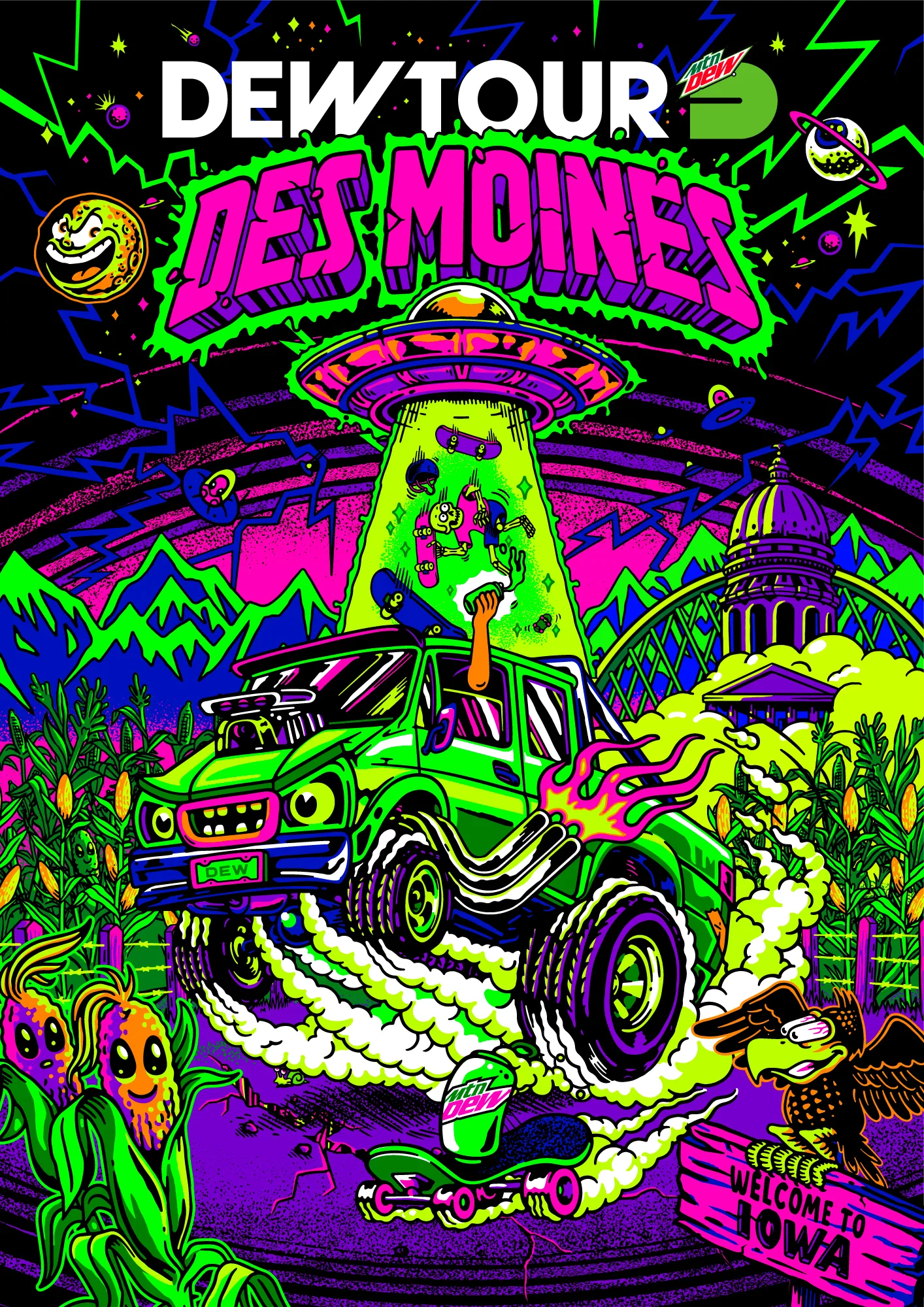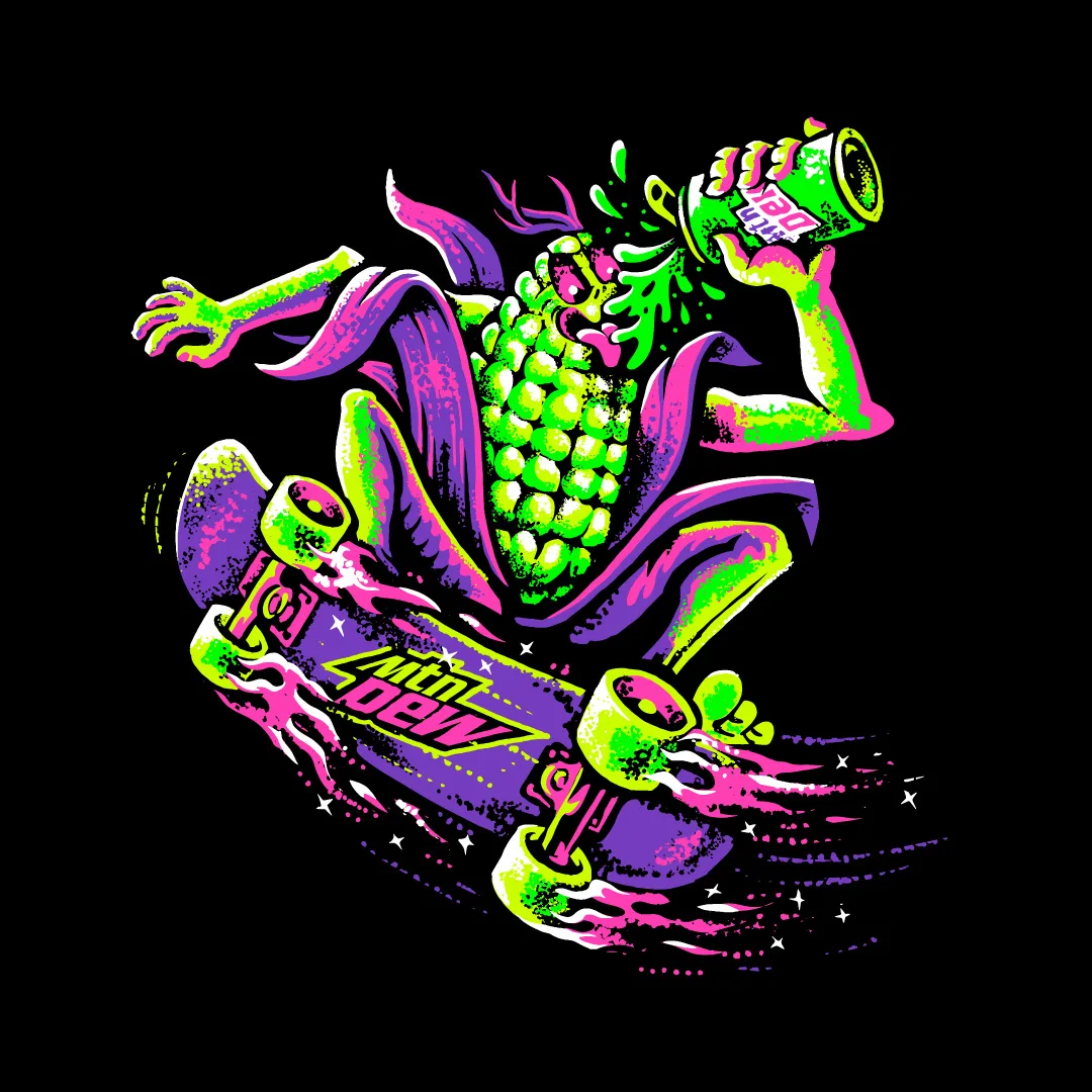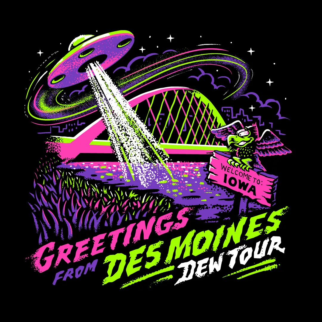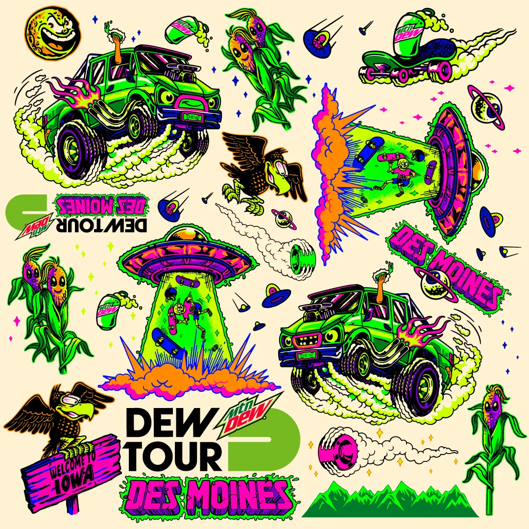 This summer our skate dreams came true. Burn & Broad partnered  with our friends at Mountain Dew to create the brand identity and visual language for Dew Tour ’22 pro skateboarding competition and festival. For the event’s launch, we created a fictional world of characters inspired by skateboarding, Mountain Dew and Des Moines.