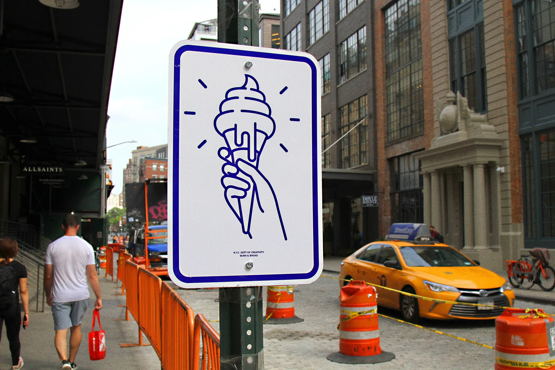 Self-InitiatedThis summer, Burn & Broad took to the streets with a self-initiated public art installation, transforming iconic city street signs into eye-catching artistic visuals. The studio, launched their own campaign in an effort to celebrate creativity and positivity in the city they call home. A sharp contrast to the dizzying and wordy signage that typically fills the city’s streets, Burn & Broad’s signs create lighthearted, humorous and artistic graphics that force passerbys to look up, peal their faces away from their phones and simply…smile.